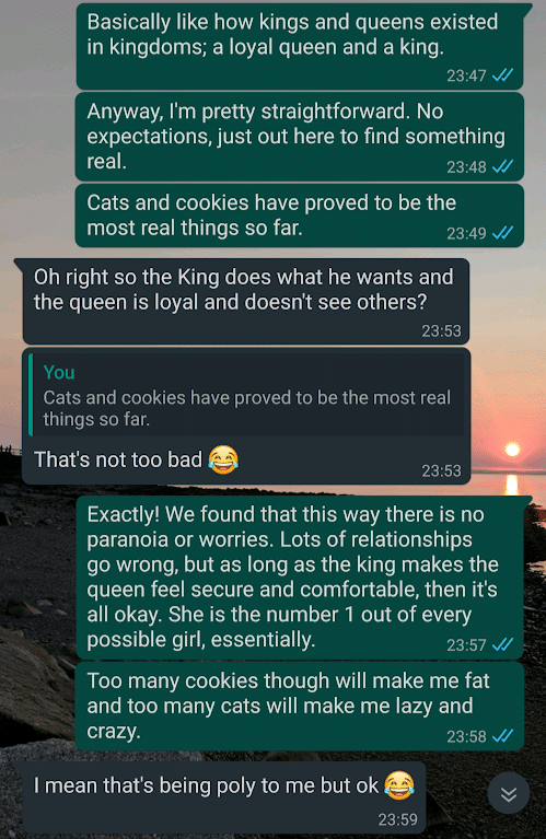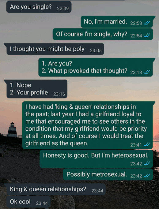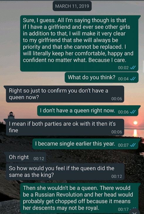 One time, a girl I matched with on Tinder specifically asked me if I’m ‘polygamous’ shortly after I got her phone number. After already establishing 2 separate king & queen relationships by then, I had a better understanding of it and decided to tell her about it. Just ignore the constant sarcasm in between.